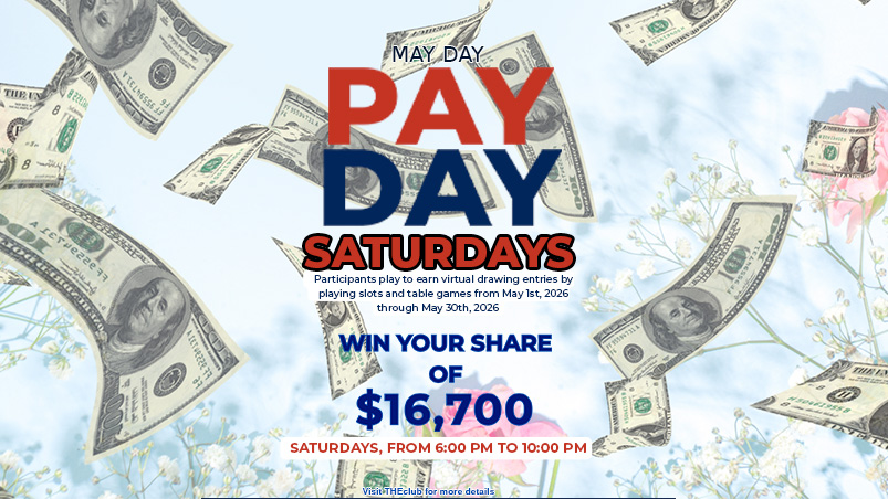 Wednesdays – March 4, 11, 18, 25 Club members will purchase a $40 promotional voucher from the cashier’s cage and redeem at THEclub for $50 in Restricted Free Slot Play, starting at 8am to 11pm. Participants can only redeem one (1) promotional voucher per promotional day.
