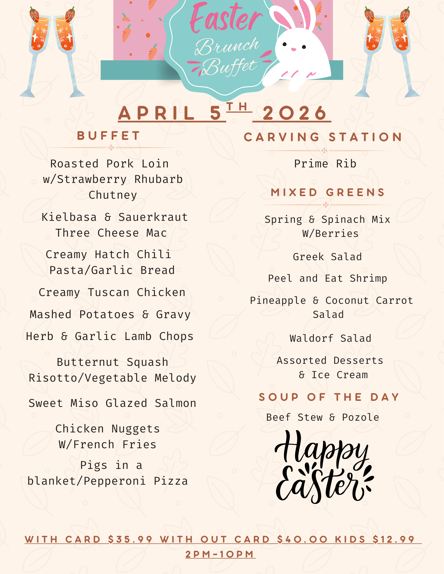Easter Day Buffet  April 5th 2026 Roasted Pork Loin w/ Strawberry Rhubarb Chutney Kielbasa & Sauerkraut /Three Cheese Mac Creamy Hatch Chili Pasta /Garlic Bread Creamy Tuscan Chicken Mashed Potatoes/Gravy […]